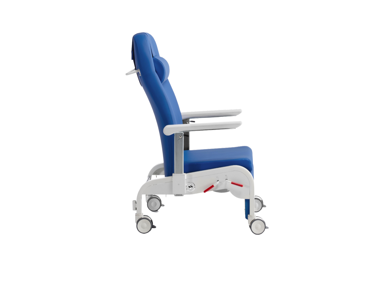 - Bilateral supports for urine bags integrated into the structure of the chair