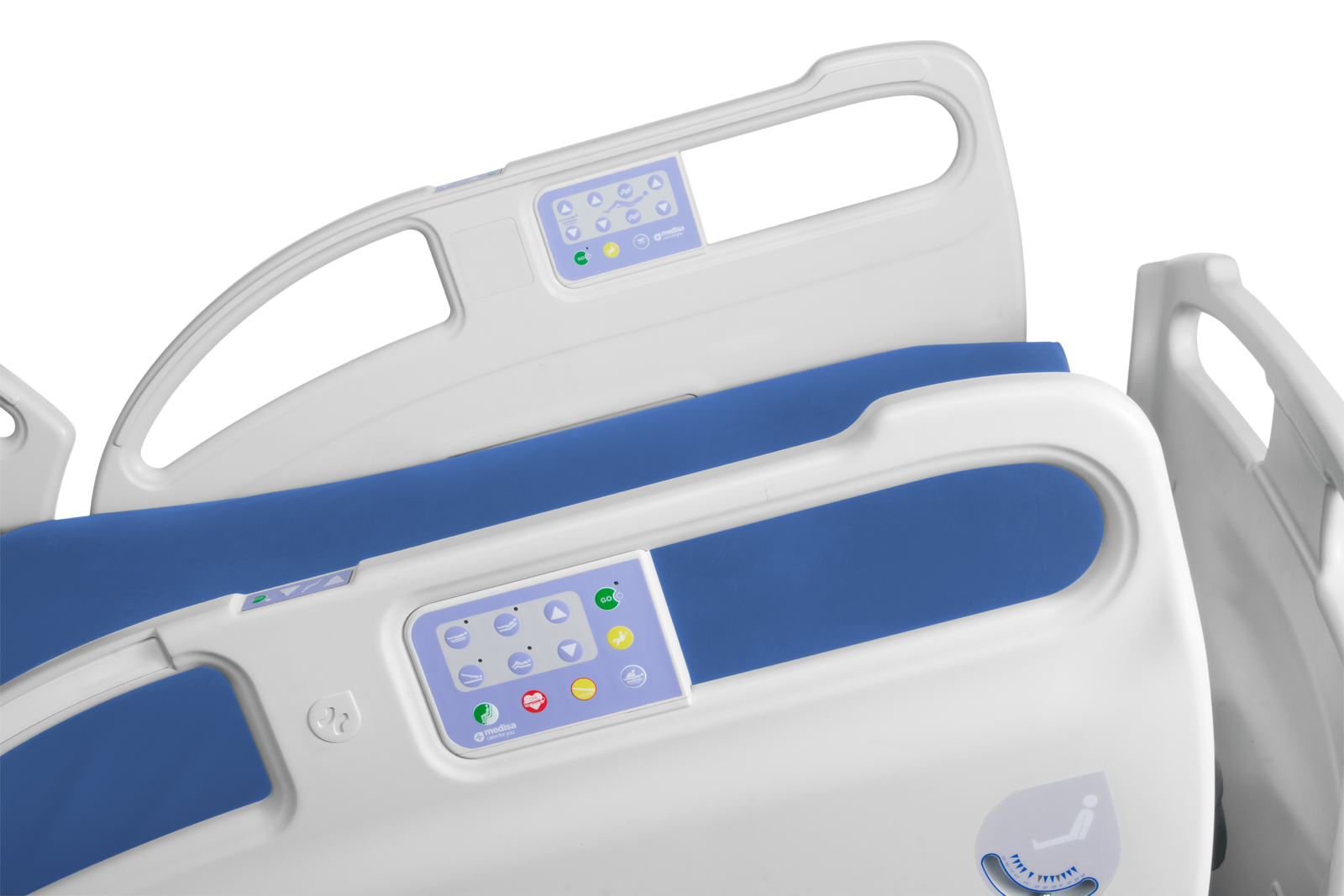Patient handset (inside rails): Allows patients to control and regulate the sections of the backrest, back/foot and height, activation of the “GO” button and the night light under the bed