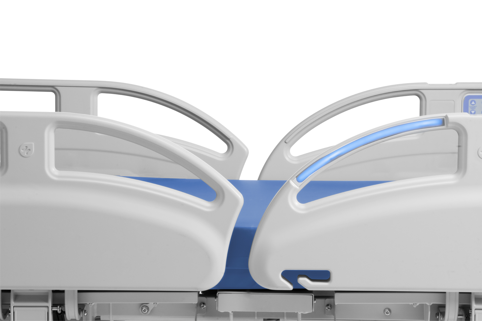 Four independent HDPE Medical side rails in accordance with standard rule EN 60601-2-52 with gas spring assist and one hand operation